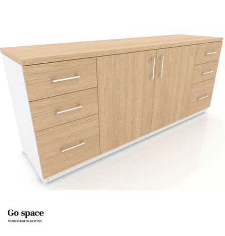 Credenza modelo “Z” con 6 cajones, 2 cajones papeleros y 1 cajón tamaño oficio con corredera de extensión completa con cerradura, y 2 puertas abatibles con entrepaño interior. Fabricado en melamina de 28mm con cantos...