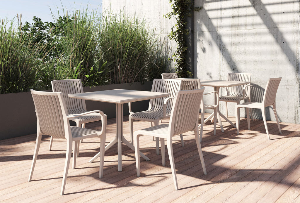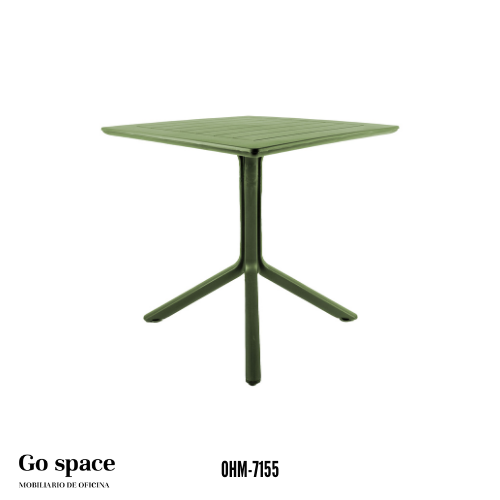 mesa: en termoplástico polimerizado de polipropileno de baja densidad para intemperie e interior, resistente a los rayos ultravioleta (UV), al ambiente salino, a los cambios bruscos de temperatura y a corrosión de ácidos alcalinos; es inocuo y no guarda aromas.