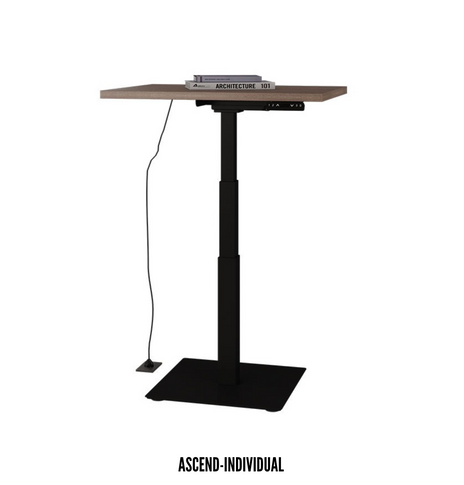 Memoria de tres posiciones, Altura ajustable de 0.53 a 1.19 mts. Materiales: Base metálica con acabado de pintura silver o negro y cubierta de melamina. Medida: 0.80 de frente x 0.60 de fondo mts.