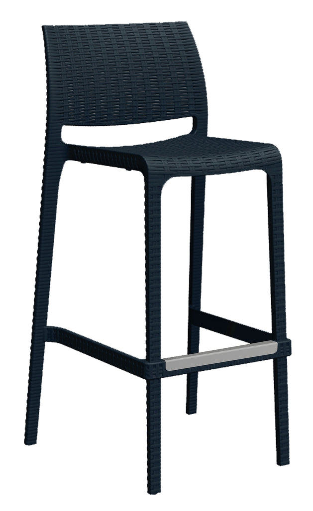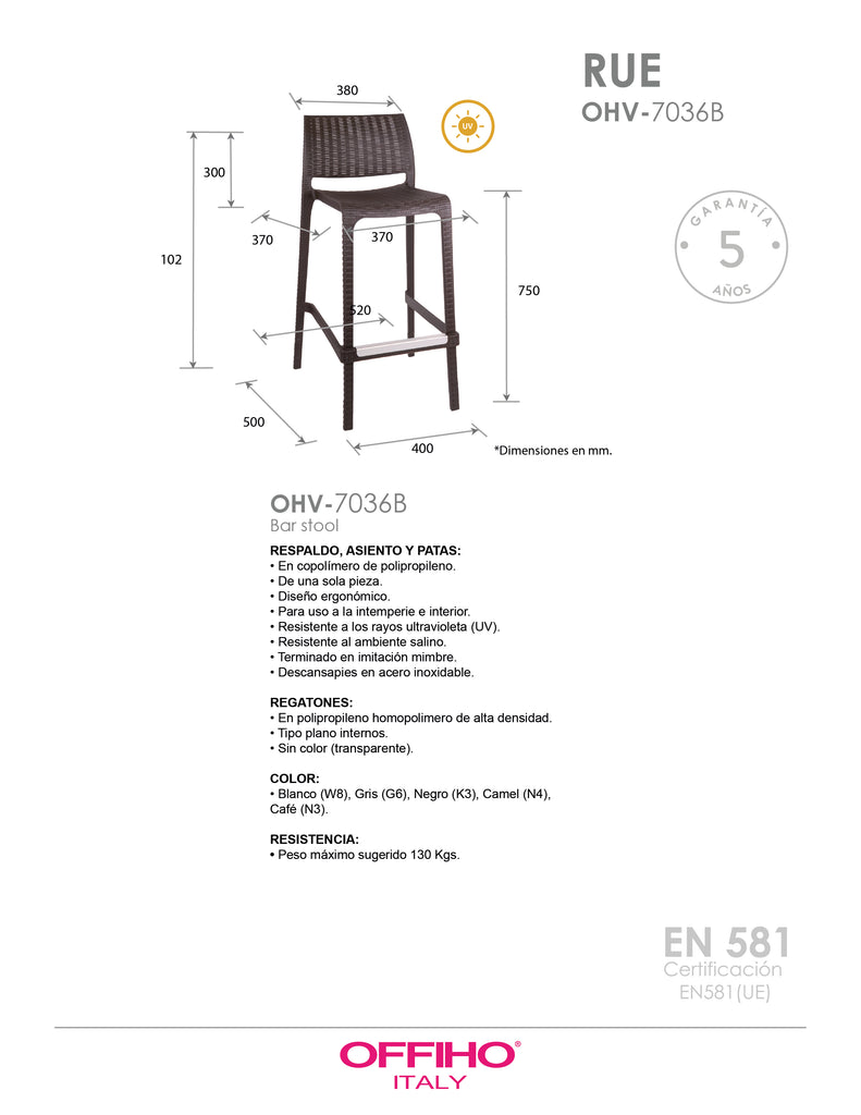 patas, asiento y respaldo:  de una sola pieza en polipropileno de alta resistencia y duración para la intemperie, resistente a los rayos ultravioleta (UV) y al ambiente salino.