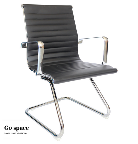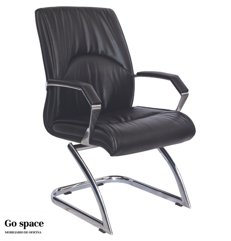 base: trineo de acero tubular rectangular de 1 1/2" X 3/4", calibre 14; con terminado en cromo. Los brazos son una extensión de las mismas patas, están acojinados y tapizados en soft revolving leather color negro.asiento...